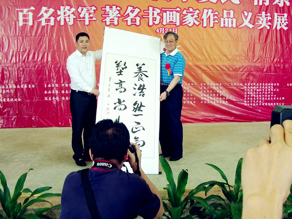义卖活动在热烈的气氛中开拍。首先拍出的是郭玉祥将军的一幅书法作品:“养浩然正气 塑高尚人格”。成交价50000元人民币。
